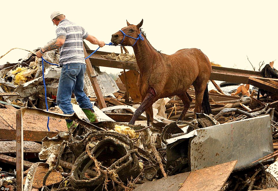 A horse is rescued from the rubble of a barn that was destroyed during the massive tornado in Oklahoma