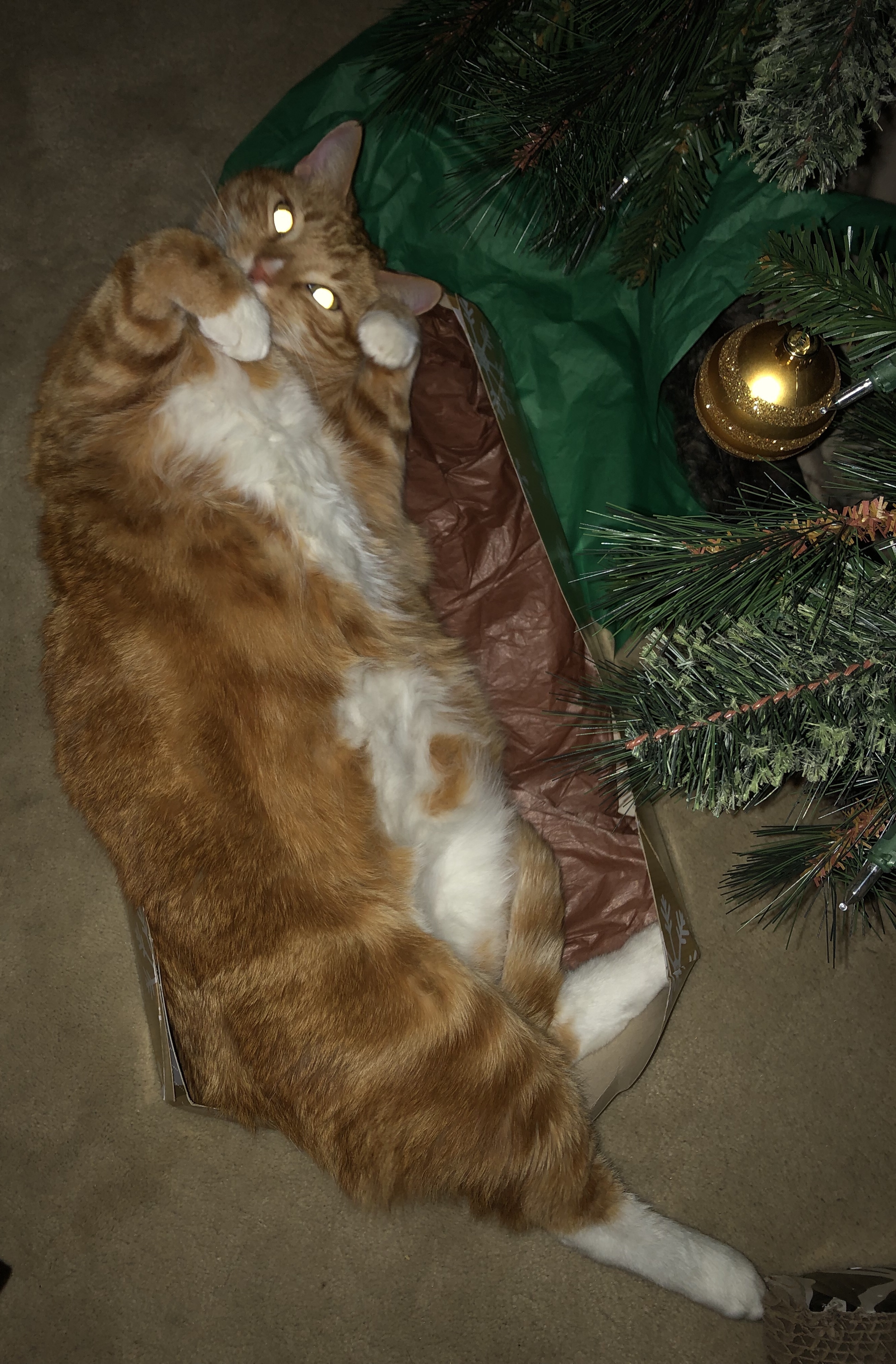 - Mr. Beaux (19 years of age) and his buddy Knox (9) enjoying some Box Time under our Christmas Tree