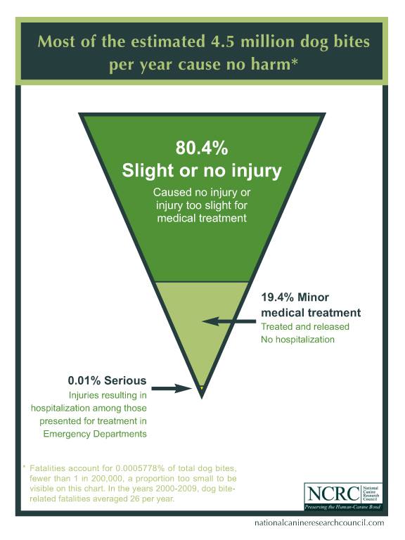 Check out this graphic from the National Canine Research Council. This graphic puts (reported) national dog bites into perspective. We need to focus on facts, not fear when educating.